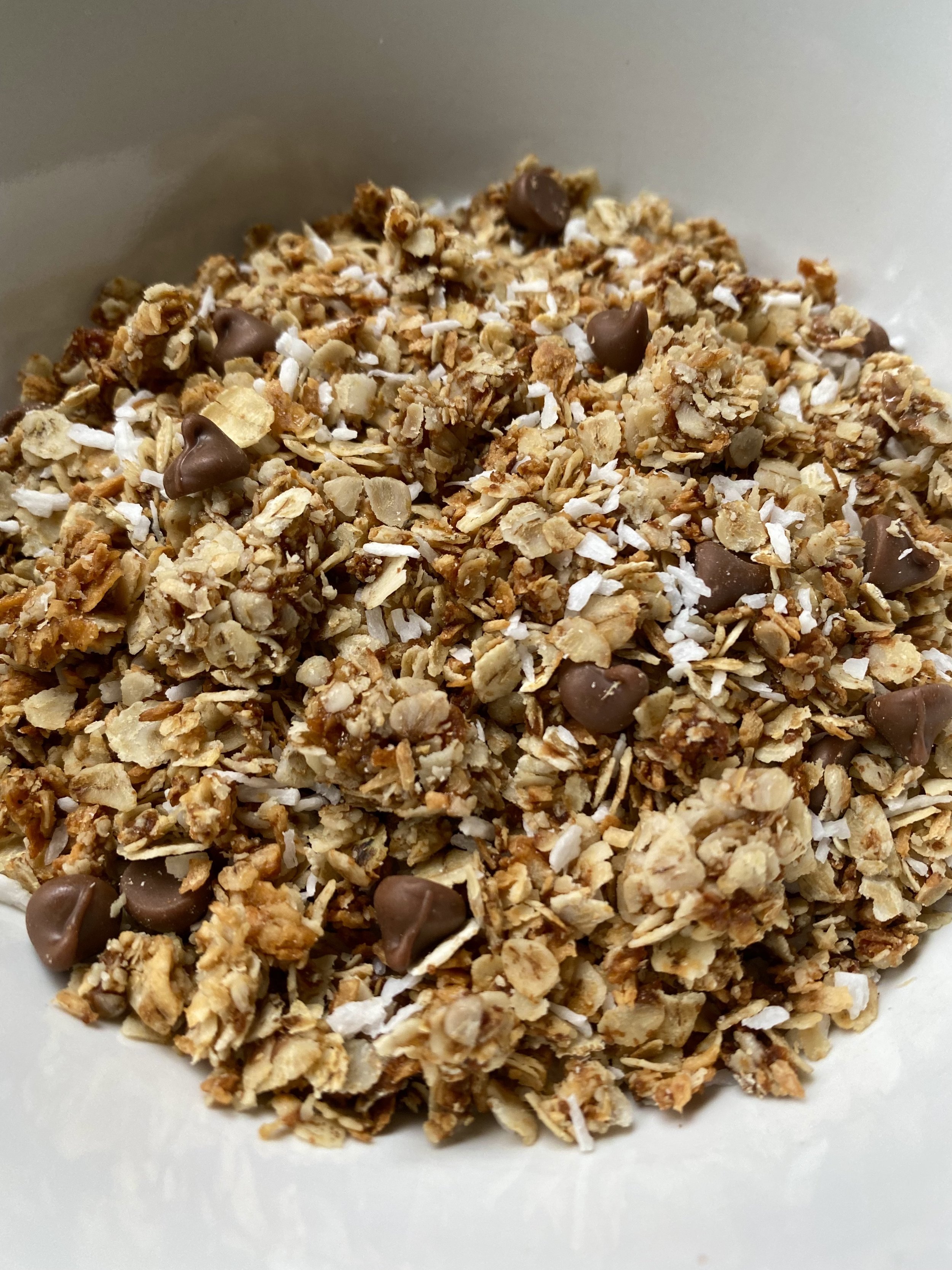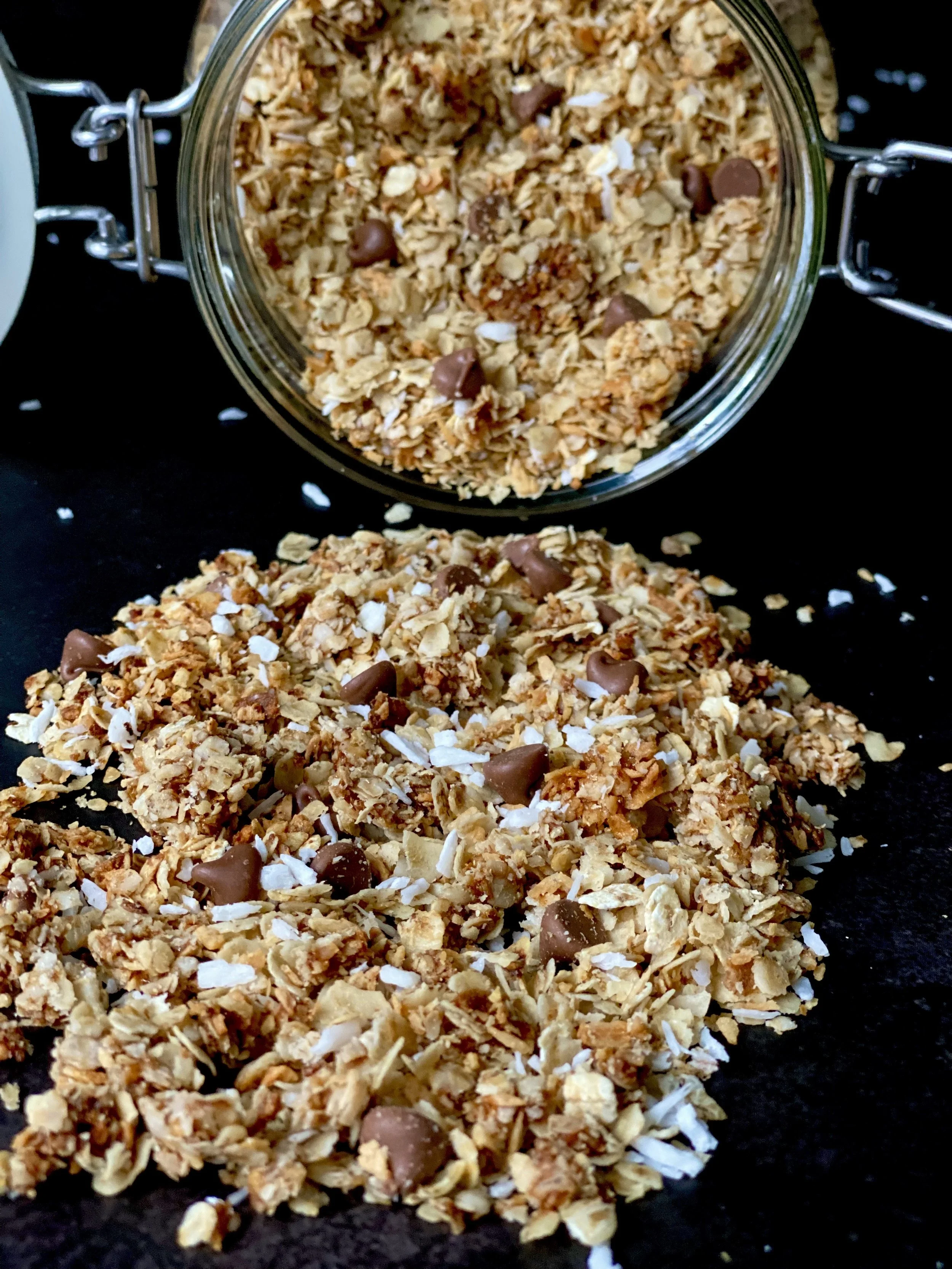 First, you need to melt and combine coconut oil, coconut sugar, and honey. Then it is mixed with the oats and desiccated coconut and spread on a baking tray. All is baked in the oven for 25 minutes. When the granola has cooled down, all you need to do is add the chocolate drops and some more desiccated coconut.